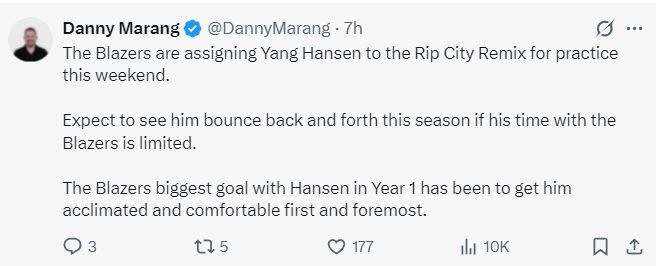 开拓者另一记者Danny Marang透露了杨瀚森新的培养计划,如果杨瀚森在开拓者无法获得轮换时间,那么预计杨瀚森会在本赛季频繁的往返混音队与开拓者队,开拓者首个赛季的目标是让杨瀚森尽快适应、融入球队,而且要让杨瀚森感到自在舒适。