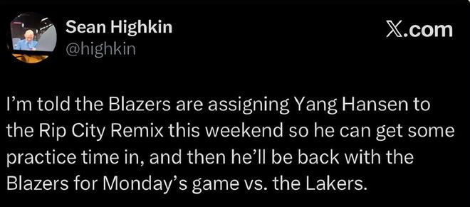 根据开拓者记者Sean Highkin的报道,杨瀚森在被下放发展联盟后会在混音队训练,在开拓者11月4日主场对阵湖人的比赛中再度将杨瀚森召回。