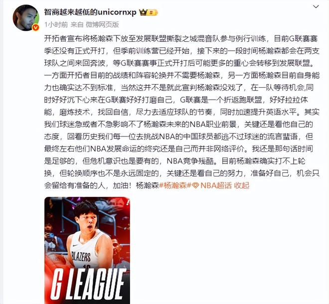 欧洲篮球专家王健表示:接下来一段时间杨瀚森会在混音、开拓者两队之间奔波,等G联赛开赛后他重心应该会转移到发展联盟,一方面开拓者战绩、阵容轮换不需要杨瀚森,另一方面杨瀚森自己能力不足。